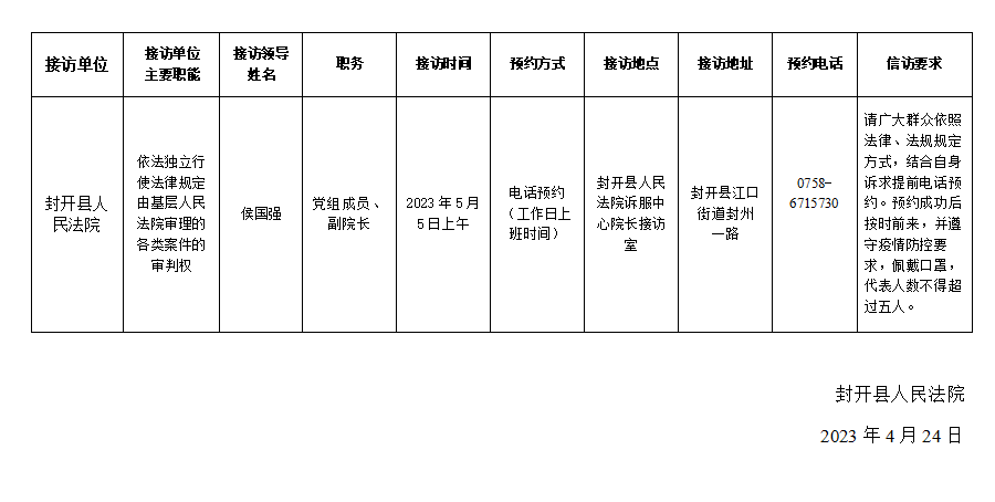为进一步畅通群众信访渠道,方便群众反映问题,切实提升为民服务水平,现将封开县人民法院院领导信访接待时间、接待地点予以公布: